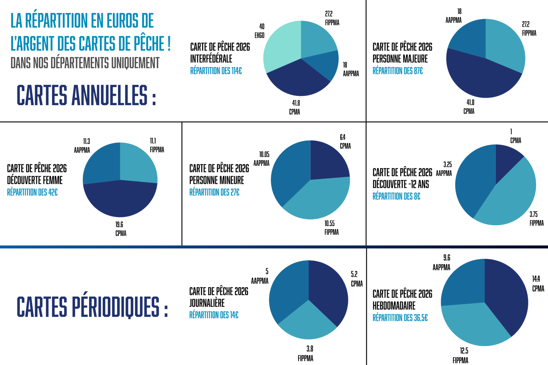 Sur le prix total d'une carte de pêche, une première partie revient à l'Etat et à la Fédération Nationale de Pêche en France via la Cotisation Pêche & Milieux Aquatiques (CPMA), une seconde partie revient à la Fédération départementale de pêche et une troisième partie revient à l'Association de pêche (AAPPMA) qui détient le droit de pêche.