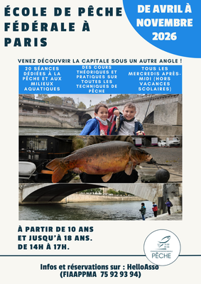 Informations et réservations : https://www.helloasso.com/associations/federation-de-peche-et-de-protection-du-milieu-aquatique-fiaappma-75-92-93-94/evenements/ecole-de-peche-federale-a-paris